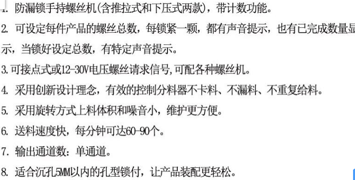 ![]() ![]() 吹气式自动供螺丝机是专门为搭配自动机,手臂而研发的一款自动送螺丝的设备,具有安全,高效,运行稳定等特点,被广泛应用于各个行业。 此款机器料仓容量为1.5L(M3X8的螺丝可以盛放1900颗),可以做到在接收到控制系统的吹钉信号后0.5秒内吹出一颗螺丝到夹嘴处。 产品规格: &产品型号:ME-6000 &工作气压:5.5± 0.5kg/m² &工作环境:0-45℃ &产品尺寸:380x250x170(长*宽*高) &速度:60pcs/分钟 |